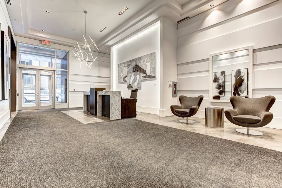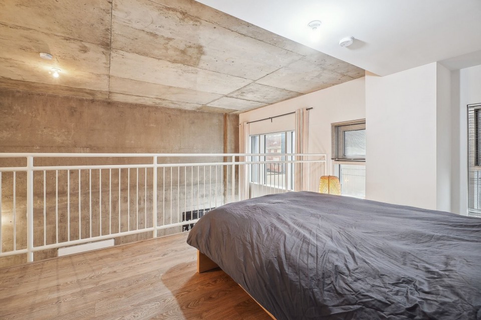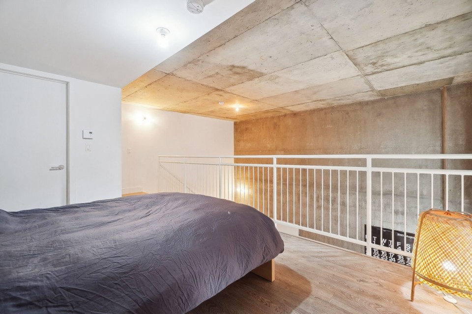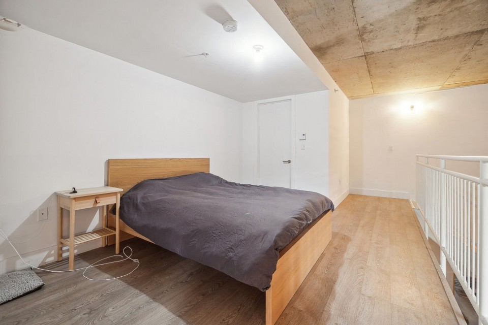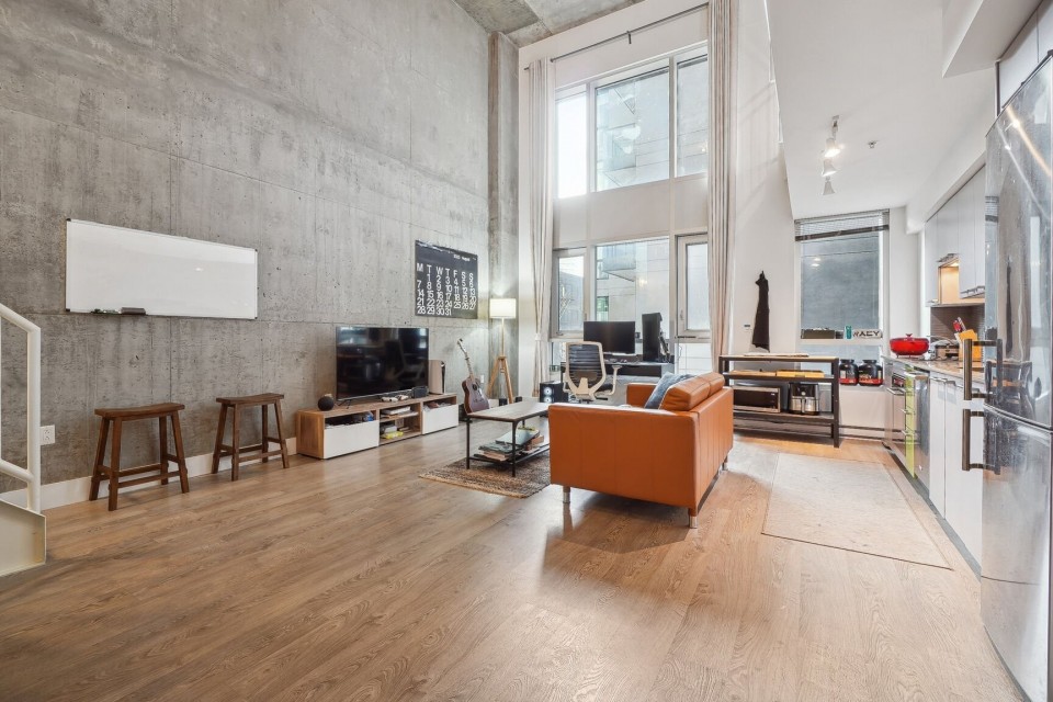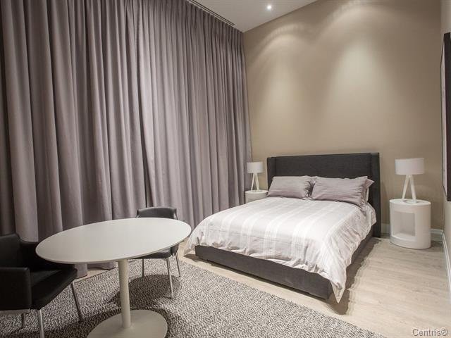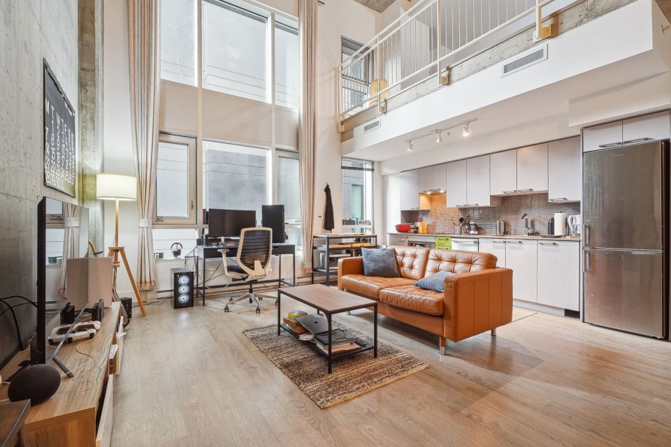 One of the largest Lofts condos in Le Peterson!!! Spectacular and airy loft with 18 ft ceilings and enormous windows. Plenty of sunlight enters this ultra hip & spacious residence. Rent this spacious condo and be close to the famous Entertainment district, Quartier des Spectacles, McGill University, UQUAM (University of Quebec in Montreal), and the Financial District. The building is a few steps from the Place Des Arts metro as well as multiple restaurants and services. Occupancy available Aug 1 2025. Don't miss your chance to live in this modern and chic space! Available for occupancy Aug 1 2025. This condo is unique as it is one of only a few spacious and airy loft in Le Peterson. It has 2 floors with a bedroom on the mezzanine and a large open area on the main level comprising living room, dining room, kitchen, bathroom and equipped laundry room. The ceiling is 18 feet high with large floor-to-ceiling windows letting in the sunlight. The large bedroom has an extremely long walk-in closet that also leads to another exit on the 6th floor with elevator access. The kitchen is fully equipped with modern stainless steel appliances, quartz countertops and a large stainless sink. The luxurious Le Peterson building offers you 24/7 security, 3 high speed elevators, a guest suite for your overnight visitors, and 5 common spaces for socialising: On the ground floor there is #1) a party/games room with large screen television, Fuzball & pool tables, popcorn and Nespresso machines as well as a presentation kitchen for your events, #2) a quiet piano lounge, and #3) a bike repair and exercise room. The 28th floor has #4) an open skydeck with a 3 flr climbing wall, BBQ, and sunning area, and #5) a gym, situated on the south-east corner and surrounded by wrap-around floor to ceiling windows offering a grand view of the Entertainment District and the St Laurent River! Please note that leases must be 1 year minimum; the building does not allow short term rental such as Air BnB, and no cannabis is permitted in the apts.
