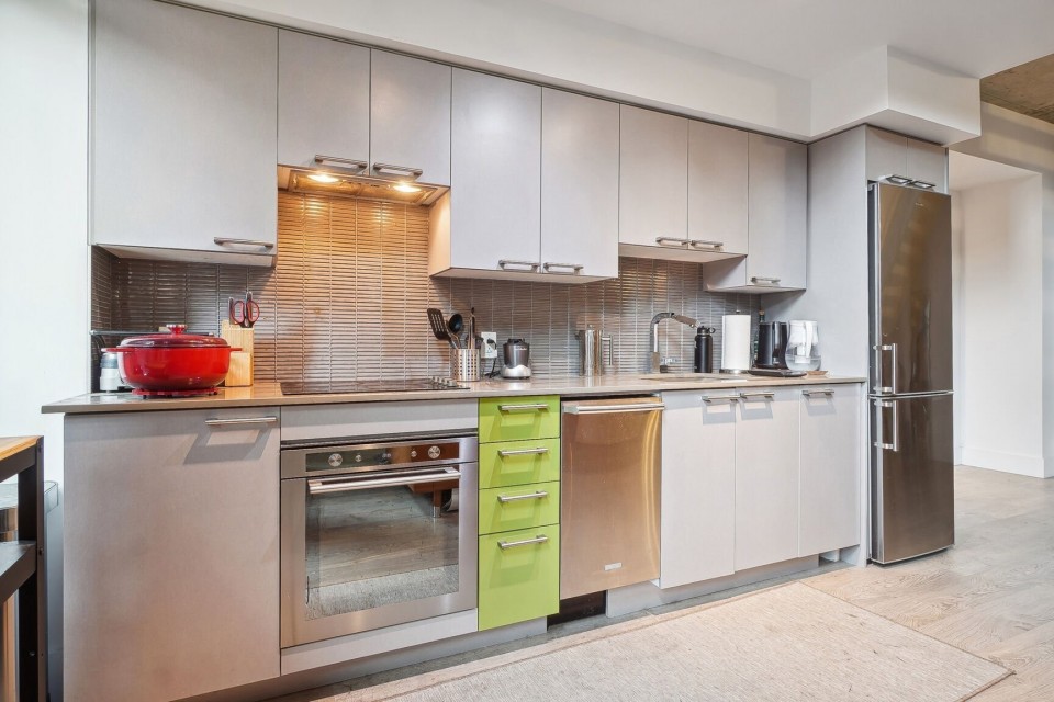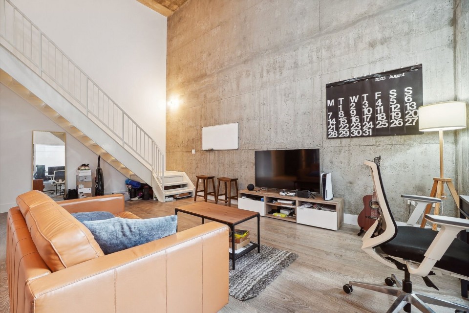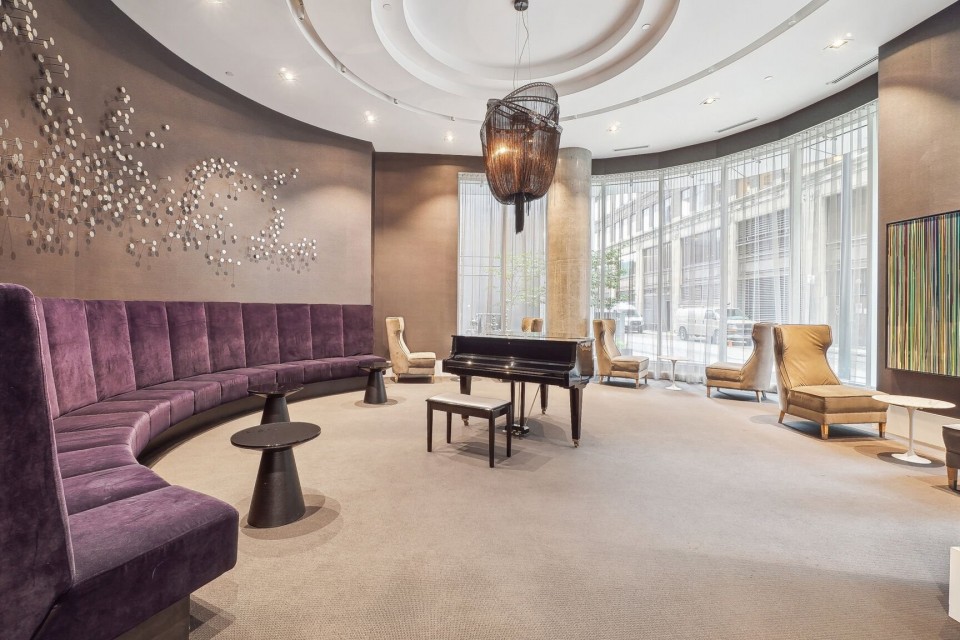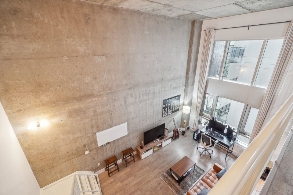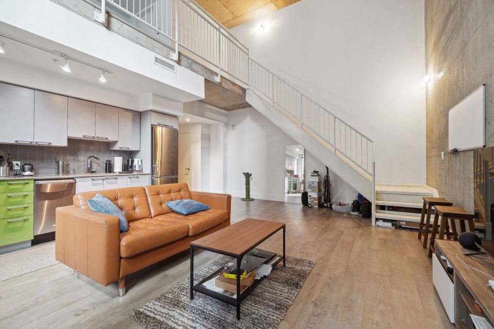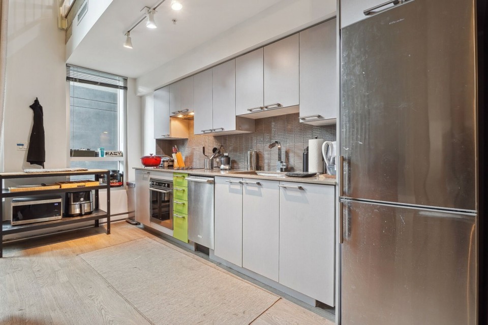 One of the largest Lofts condos in Le Peterson!!! Spectacular and airy loft with 18 ft ceilings and enormous windows. Plenty of sunlight enters this ultra hip & spacious residence. Rent this spacious condo and be close to the famous Entertainment district, Quartier des Spectacles, McGill University, UQUAM (University of Quebec in Montreal), and the Financial District. The building is a few steps from the Place Des Arts metro as well as multiple restaurants and services. Occupancy available Aug 1 2025. Don't miss your chance to live in this modern and chic space! Available for occupancy Aug 1 2025. This condo is unique as it is one of only a few spacious and airy loft in Le Peterson. It has 2 floors with a bedroom on the mezzanine and a large open area on the main level comprising living room, dining room, kitchen, bathroom and equipped laundry room. The ceiling is 18 feet high with large floor-to-ceiling windows letting in the sunlight. The large bedroom has an extremely long walk-in closet that also leads to another exit on the 6th floor with elevator access. The kitchen is fully equipped with modern stainless steel appliances, quartz countertops and a large stainless sink. The luxurious Le Peterson building offers you 24/7 security, 3 high speed elevators, a guest suite for your overnight visitors, and 5 common spaces for socialising: On the ground floor there is #1) a party/games room with large screen television, Fuzball & pool tables, popcorn and Nespresso machines as well as a presentation kitchen for your events, #2) a quiet piano lounge, and #3) a bike repair and exercise room. The 28th floor has #4) an open skydeck with a 3 flr climbing wall, BBQ, and sunning area, and #5) a gym, situated on the south-east corner and surrounded by wrap-around floor to ceiling windows offering a grand view of the Entertainment District and the St Laurent River! Please note that leases must be 1 year minimum; the building does not allow short term rental such as Air BnB, and no cannabis is permitted in the apts.
