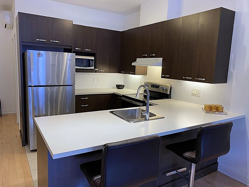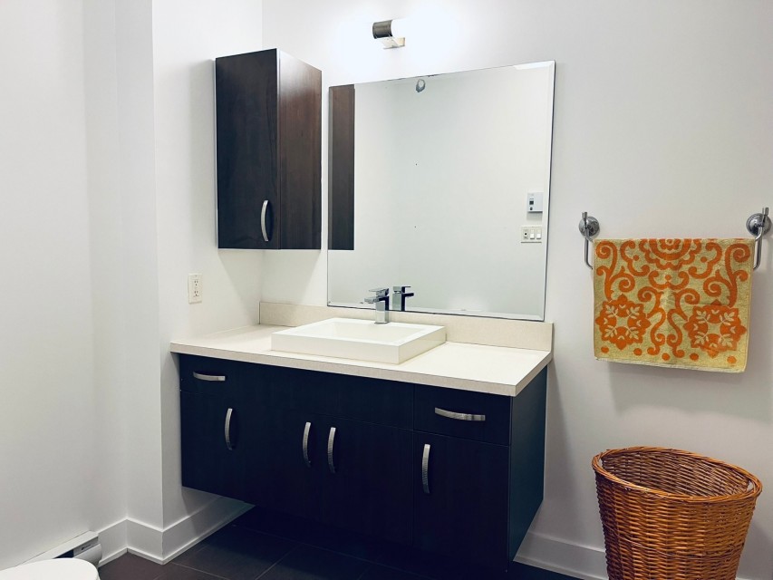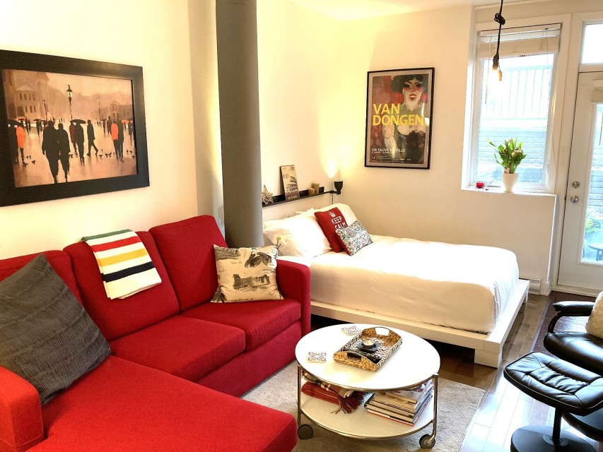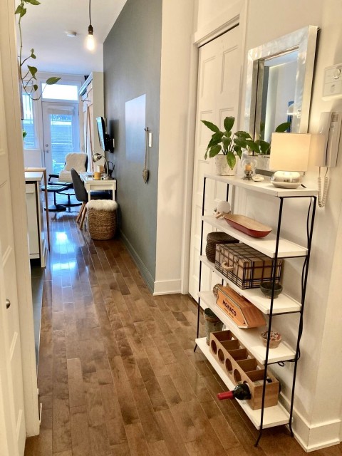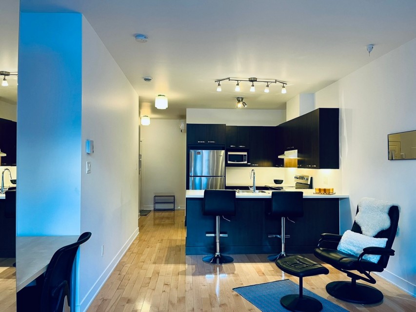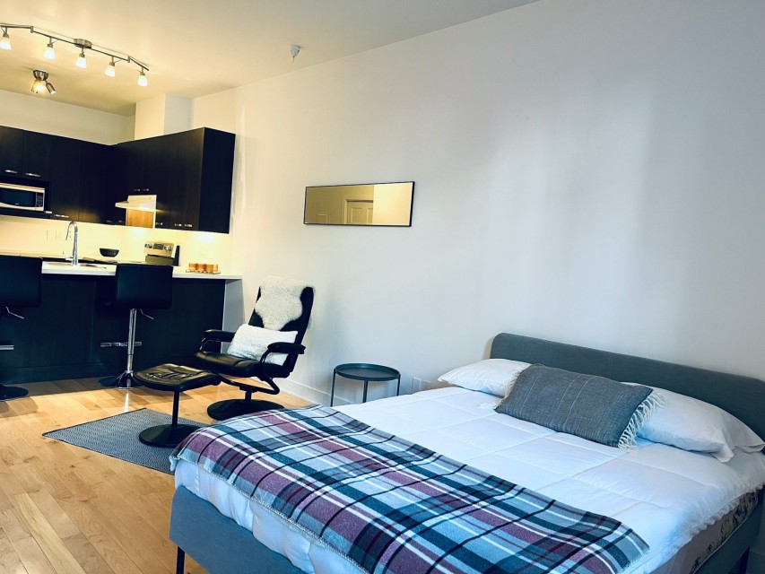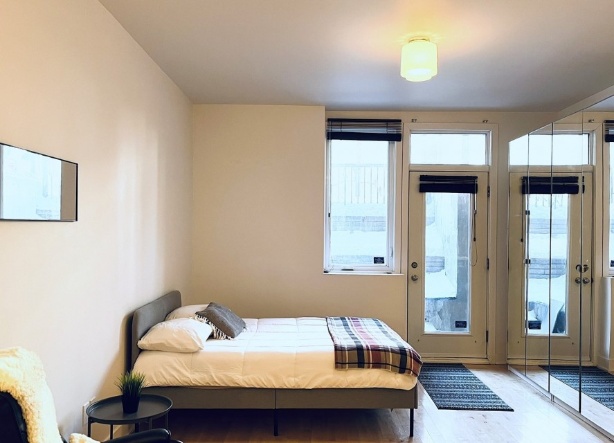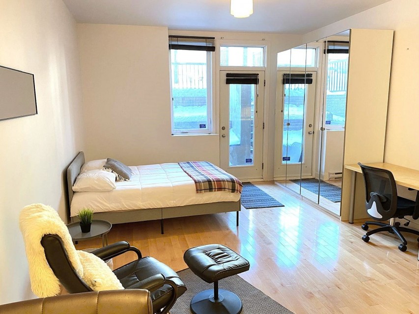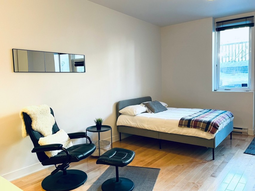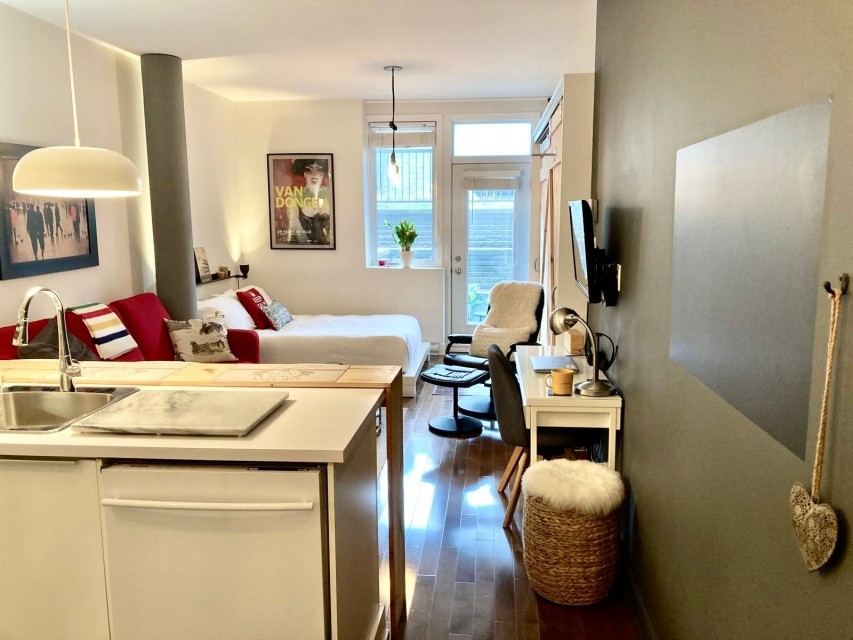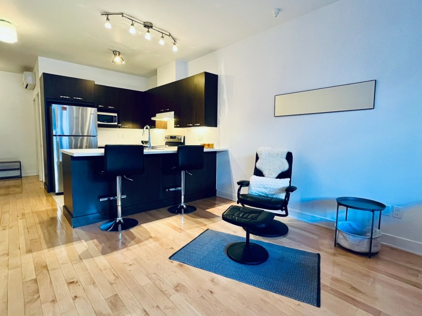 Spacious studio with plenty of room for different design options. This gorgeous open concept apt can accommodate a full-sized sofa and bed, has a large kitchen & bathroom, an office nook, and a private garden terrasse as well. High quality finishings, 9 ft ceilings, A/C unit, private indoor locker, all make this an ideal cozy home. Located conveniently, it is a 2 minute walk to the 197 and 25 bus stop, 11 minute walk to Rosemont metro and 10 minutes drive to the highway. Park Père Marquette nearby offers playgrounds, skatepark, skating rink, baseball & soccer fields, and even dog runs. Presently rented. Parking not included in the sale.