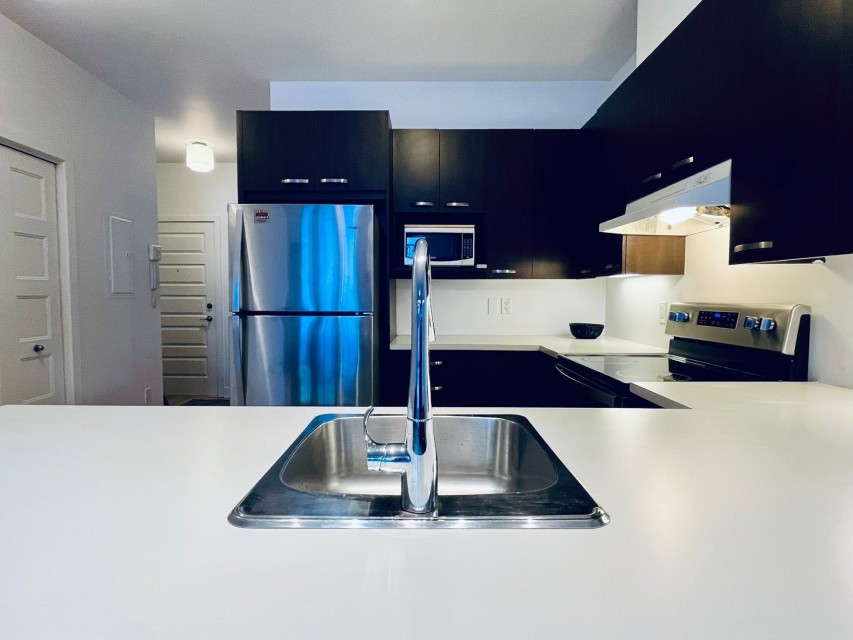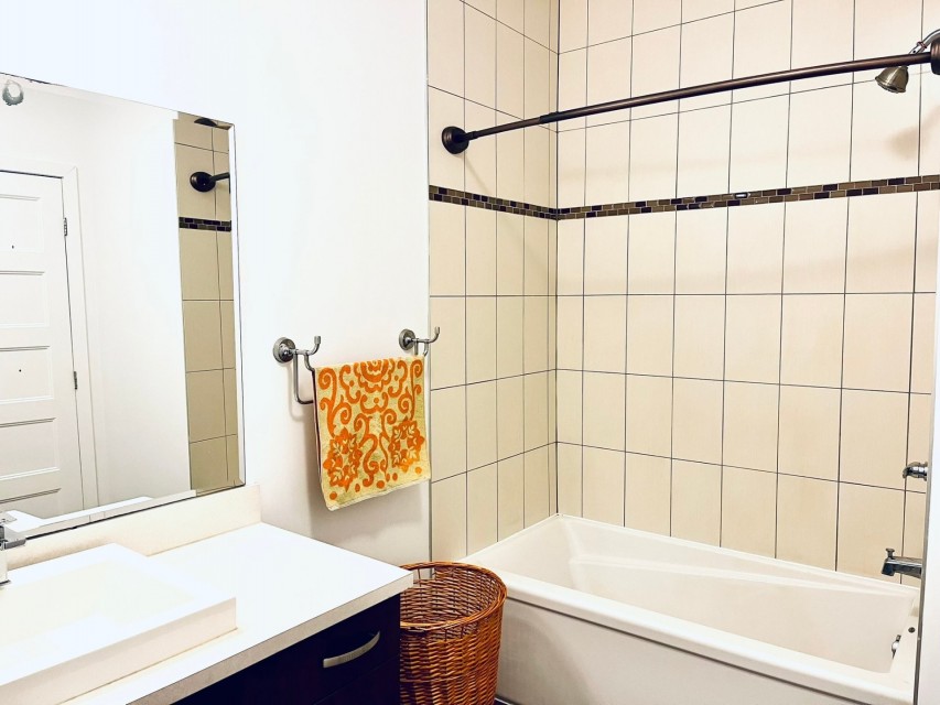 Refrigerator, stove, washer, dryer, microwave, wall-mounted air conditioning unit, 2 Pax wardrobe with mirrors, office desk and chair, blinds, 2 bar stools, bed frame, existing mattress (all "as is"). Locker.
