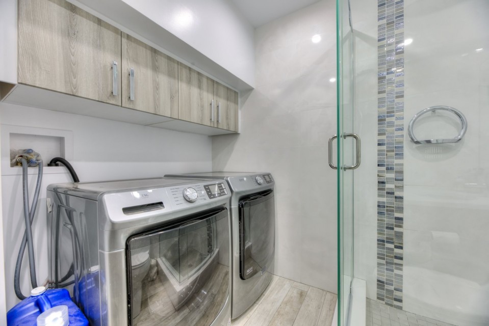 Réfrigérateur, cuisinière, Télé et rack de Télé, laveuse, sécheuse, luminaires, chargeur de voiture électrique