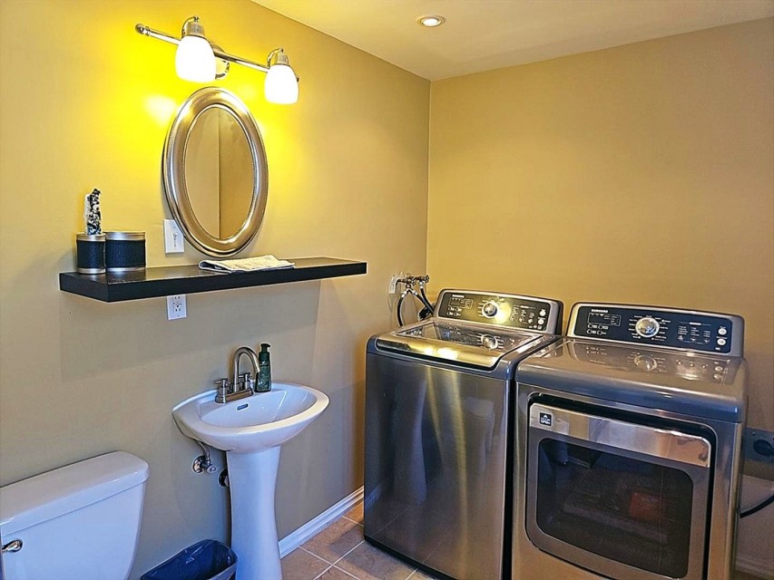 Réfrigérateur, micro-ondes, cuisinière, laveuse, sécheuse et étagères dans le garage, rideaux, stores.