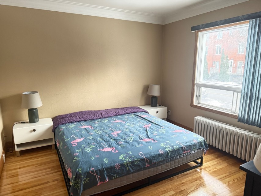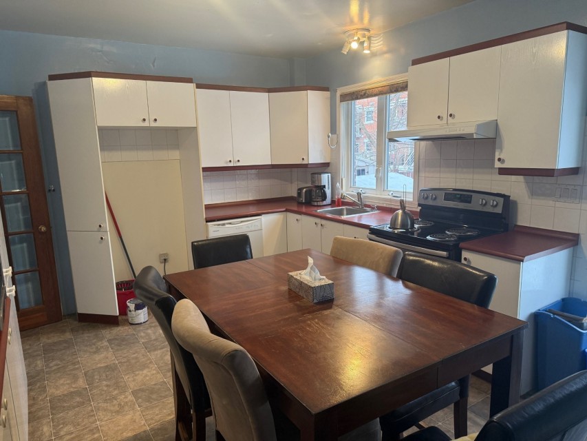 Well located 2000 sqft 2-floor apartment, sunny and bright. Four closed bedrooms, kitchen, dining room on the main floor, two bathrooms, large family room in the finished basement and workshop or gym area, plenty of storage in the apartment, and backyard with shed and private parking. Central vacuum and stove provided. Walking distance to the Monk metro station, Angrignon park, the municipal library and the swimming pool, etc. Close to all services and easy to access highway. A must see!