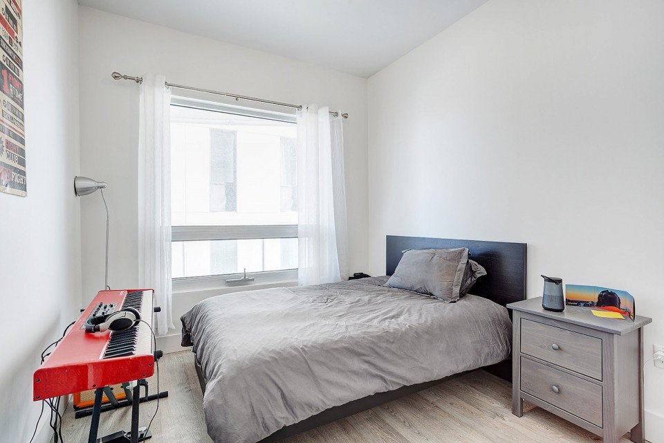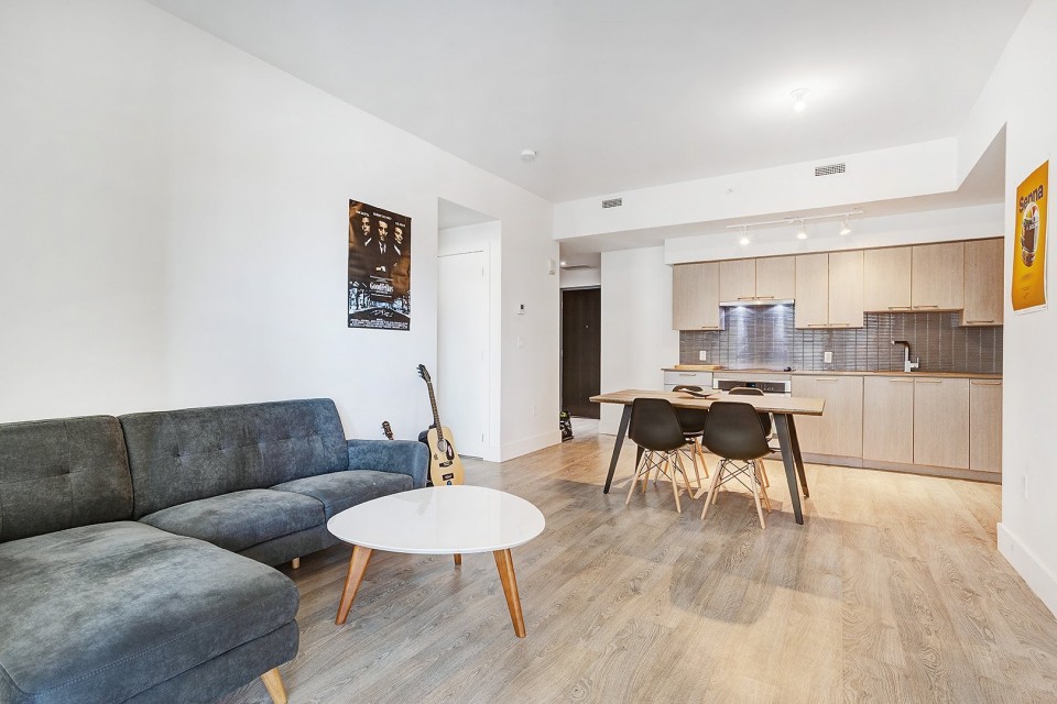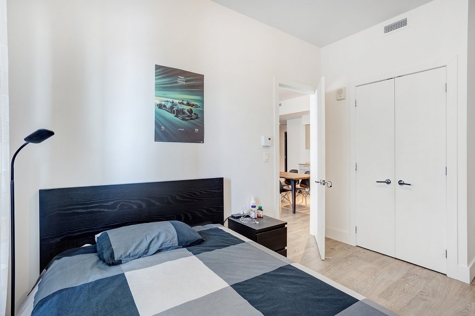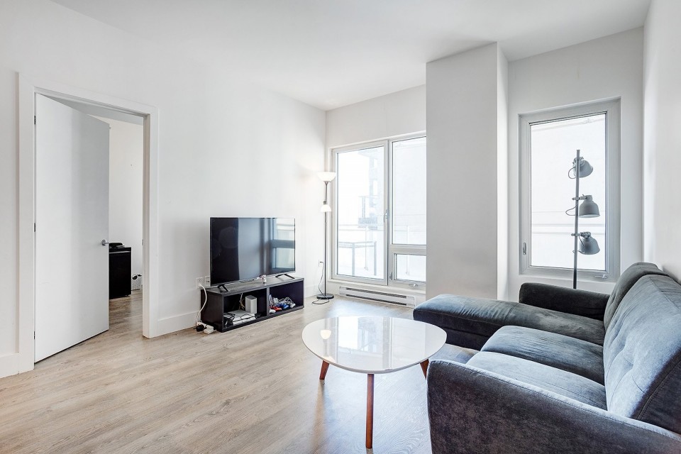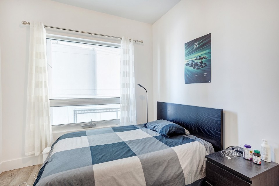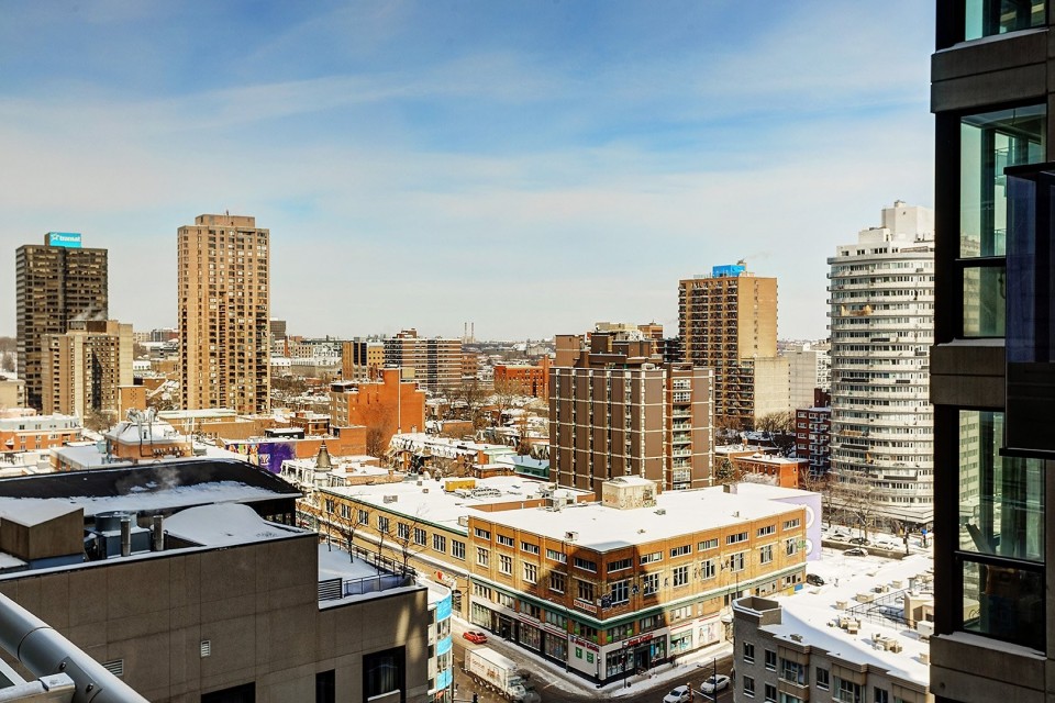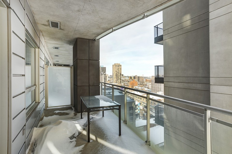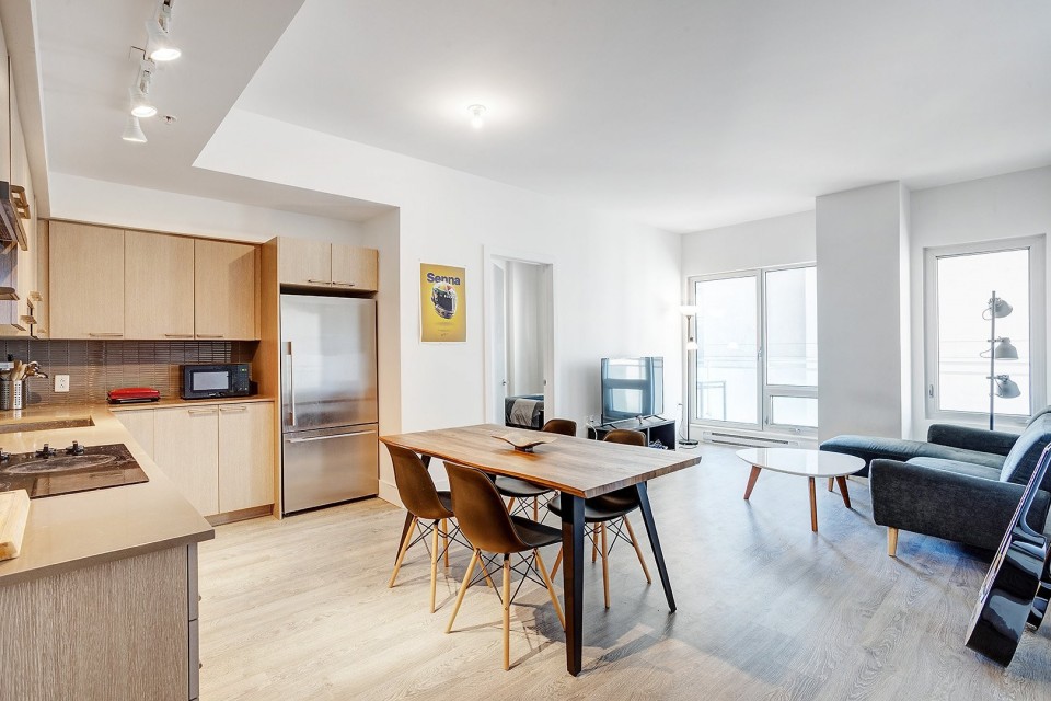 17th flr very spacious unit in the stylish LE PETERSON, offering 2 BDRM, 2 BATH + den, large windows, big balcony, and all the amenities of this luxury building. Buy this condo and be close to the financial district, McGill University, public transport, and the Quartier des Spectacles entertainment district. One locker included in the sale! Currently occupied with tenants. At least 24 hrs notice for visits. The luxurious Le Peterson building offers you 24/7 security,3 high speed elevators, a guest suite for your overnight visitors, and 5 common spaces for socialising: On the ground floor there is #1) a party/games room with large screen television, Fuzball & pool tables, popcorn and Nespresso machines as well as a presentation kitchen for your events, #2) a quiet piano lounge, and #3) a bike repair and exercise room. The 28th floor has #4) an open skydeck with a 3 flr climbing wall, BBQ, and sunning area, and #5) a gym, situated on the south-east corner and surrounded by wrap-around floor to ceiling windows offering a grand view of the Entertainment District and the StLaurent River!