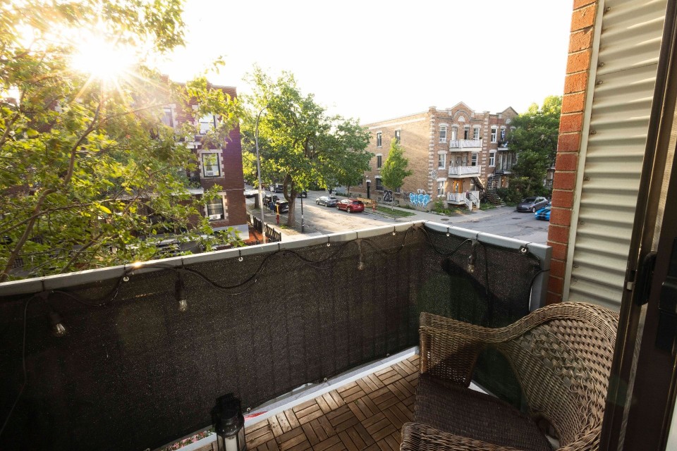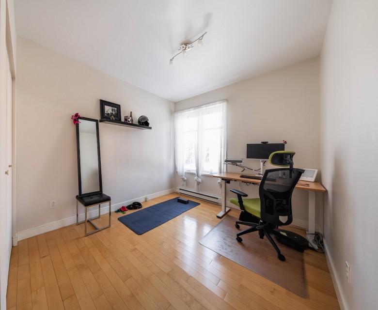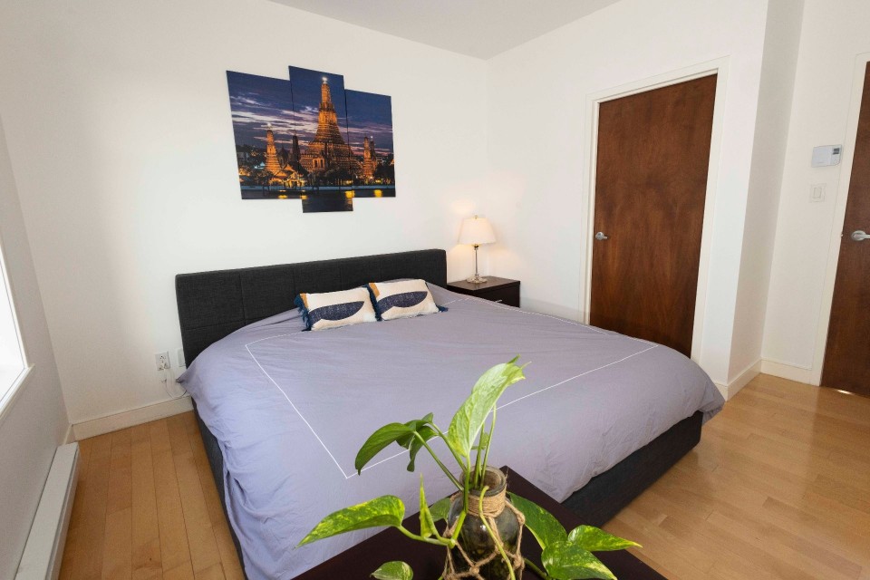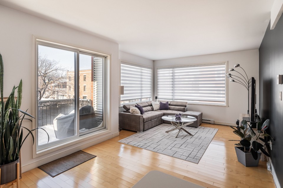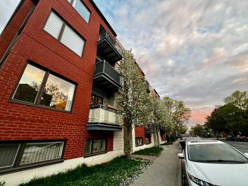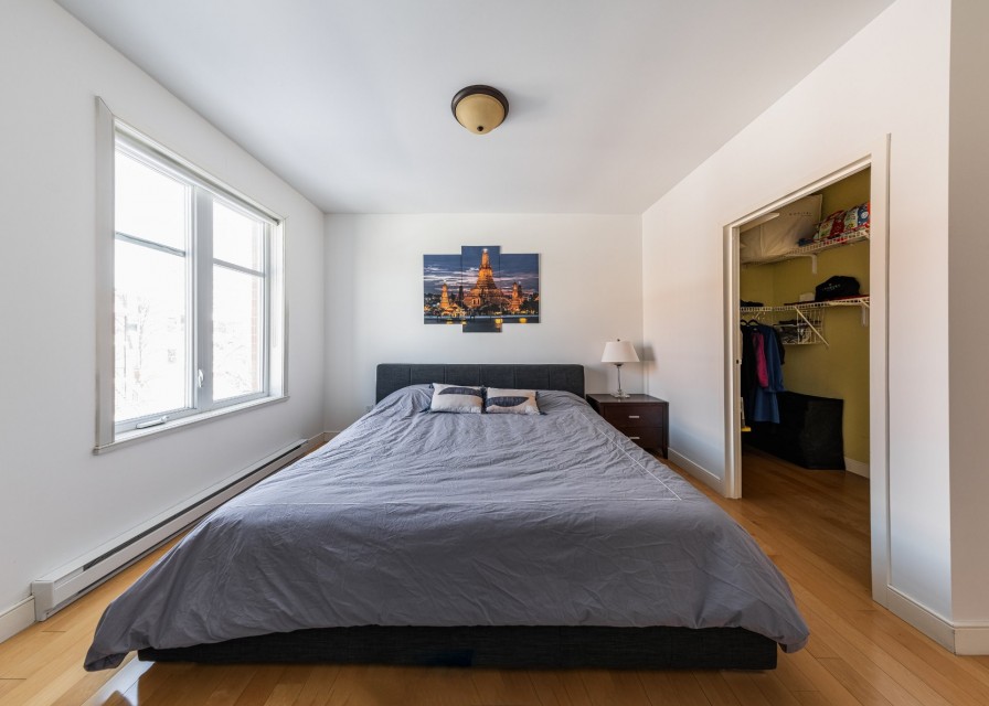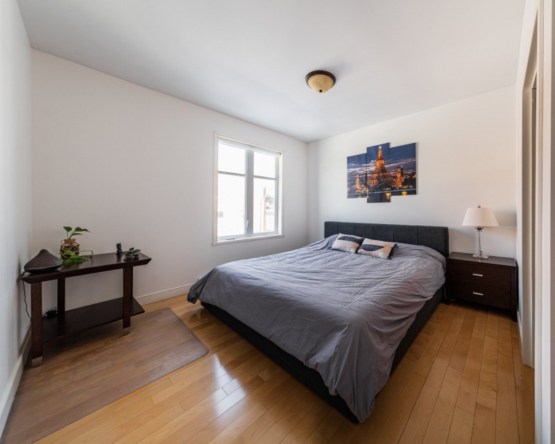 Incredible corner condo, very bright, with two bedrooms, a large bathroom, laundry room, garage, and storage. Located in a residential neighbourhood of HoMa, close to daycare centers, parks, bakeries, cafés, and grocery stores, and just a few seconds from the bike path leading downtown. The condo is very well maintained and up-to-date, featuring quartz countertops, air conditioning, and a walk-in closet in the master bedroom. Everything is within walking distance, making it ideal for families or active individuals. The building has an elevator & is part of a well-managed condominium with excellent maintenance, finances, compliant with law 16. Corner condo offering multiple window layouts (including custom-made electric blinds) and therefore better natural light compared to other units in the building, making the space brighter and more pleasant to live in. The private balcony and communal rooftop terrace add a lovely outdoor dimension, offering an unobstructed view and a private outdoor space. A video of the property is available upon request.