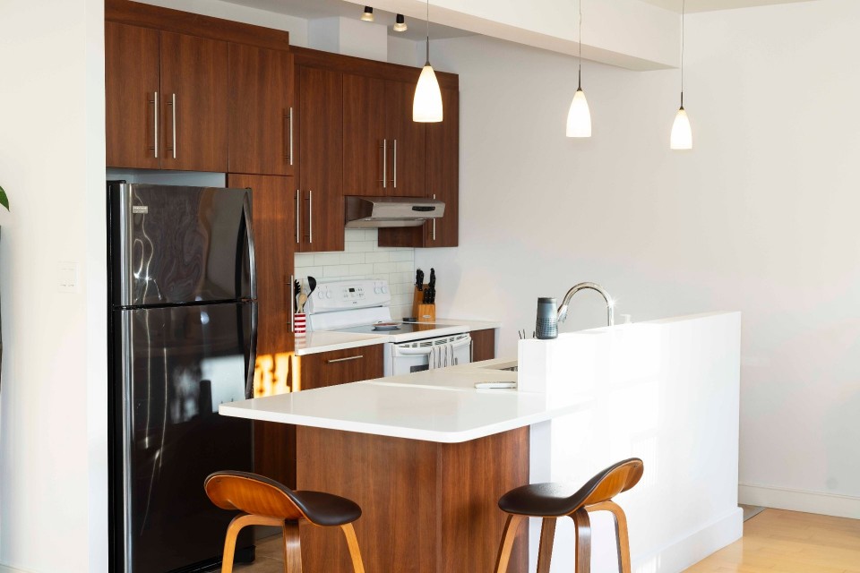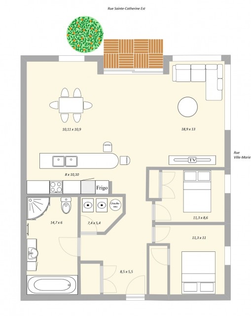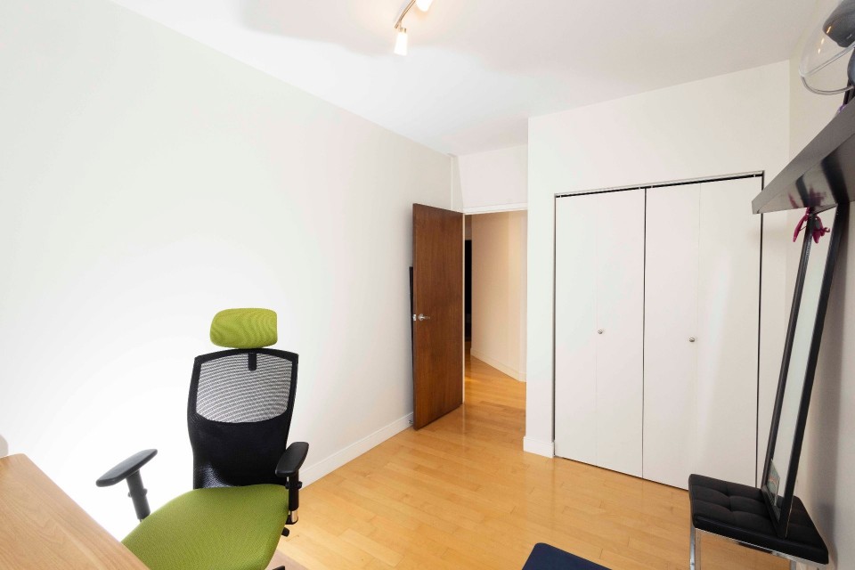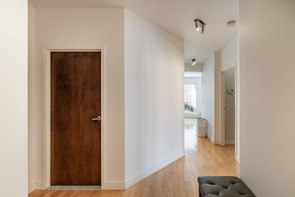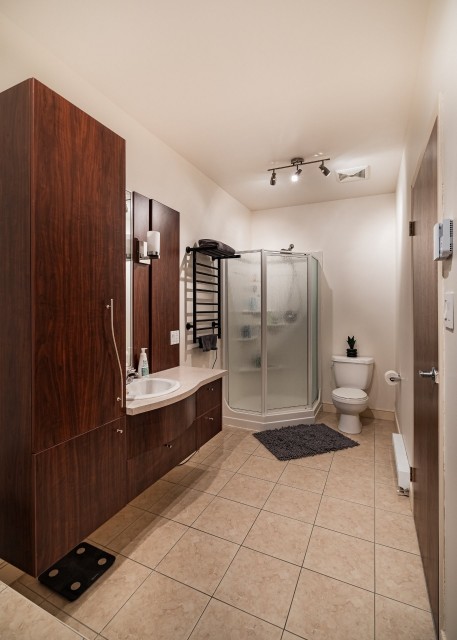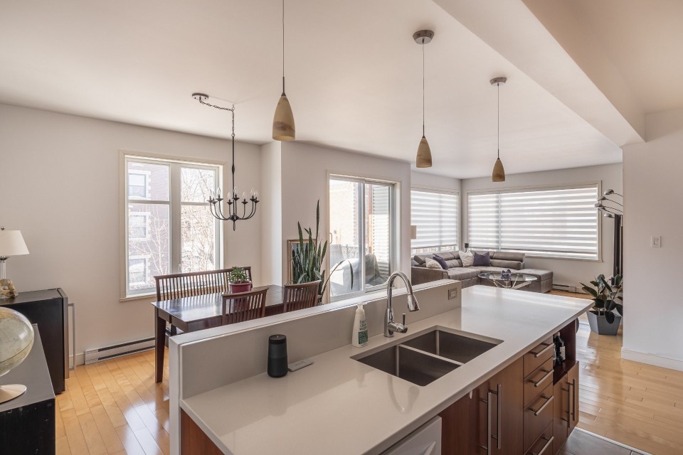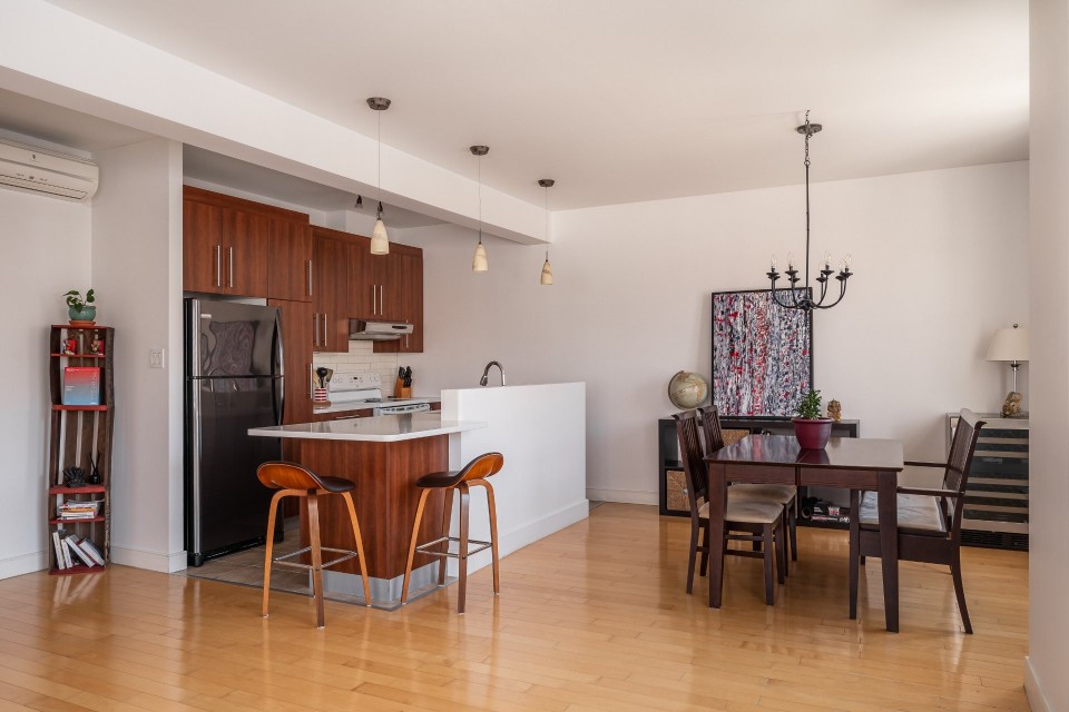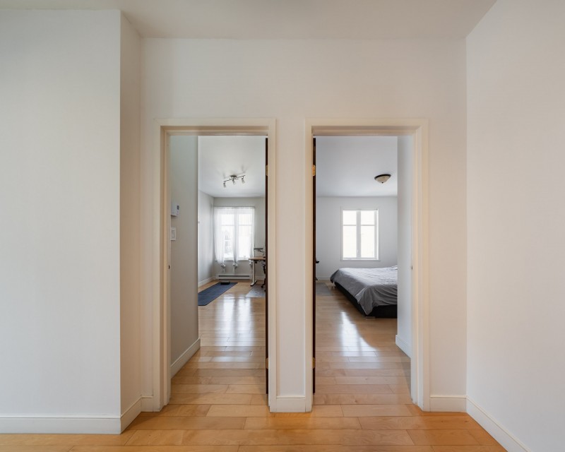 Incredible corner condo, very bright, with two bedrooms, a large bathroom, laundry room, garage, and storage. Located in a residential neighbourhood of HoMa, close to daycare centers, parks, bakeries, cafés, and grocery stores, and just a few seconds from the bike path leading downtown. The condo is very well maintained and up-to-date, featuring quartz countertops, air conditioning, and a walk-in closet in the master bedroom. Everything is within walking distance, making it ideal for families or active individuals. The building has an elevator & is part of a well-managed condominium with excellent maintenance, finances, compliant with law 16. Corner condo offering multiple window layouts (including custom-made electric blinds) and therefore better natural light compared to other units in the building, making the space brighter and more pleasant to live in. The private balcony and communal rooftop terrace add a lovely outdoor dimension, offering an unobstructed view and a private outdoor space. A video of the property is available upon request.
